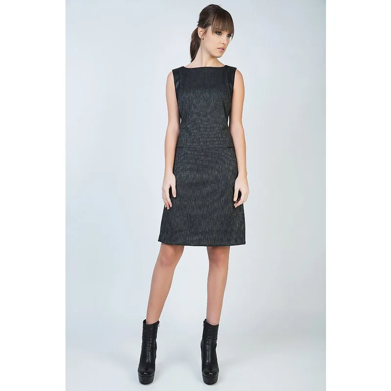 Mouwloze A-lijn jurk van Conquista Fashion in duurzame stretch jersey stof. Ons model is 176cm en draagt maat 36/S. Gemaakt in Griekenland.