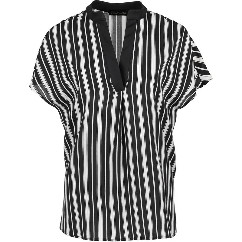 Deze wit met blauw gestreepte top is gemaakt van geweven viscose. Het is mouwloos en heeft afhangende schouders. Het heeft een mandarijnkraag en een blauwe sluiting van 3 cm aan de voorkant die eindigt in een plooi. De top heeft een ongelijke afgeronde zoom met splitjes aan de zijkanten. Het heeft een los recht silhouet.