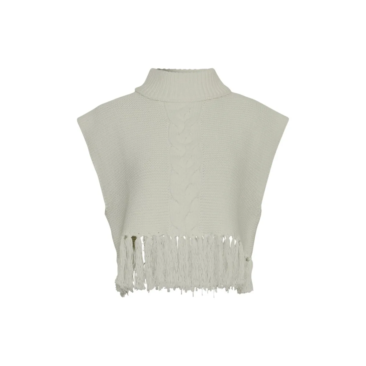De Mouwloze Trui Esmai M is een elegante gebreide top, ontworpen met een gedraaid breipaneel aan de voorkant. Het heeft een hoge kraag en een kenmerkende franjesdetail aan de zoom, wat een speelse maar verfijnde toets toevoegt. De mouwloze snit maakt het perfect om over shirts of jurken te dragen, wat zowel textuur als warmte biedt in een elegante stijl.