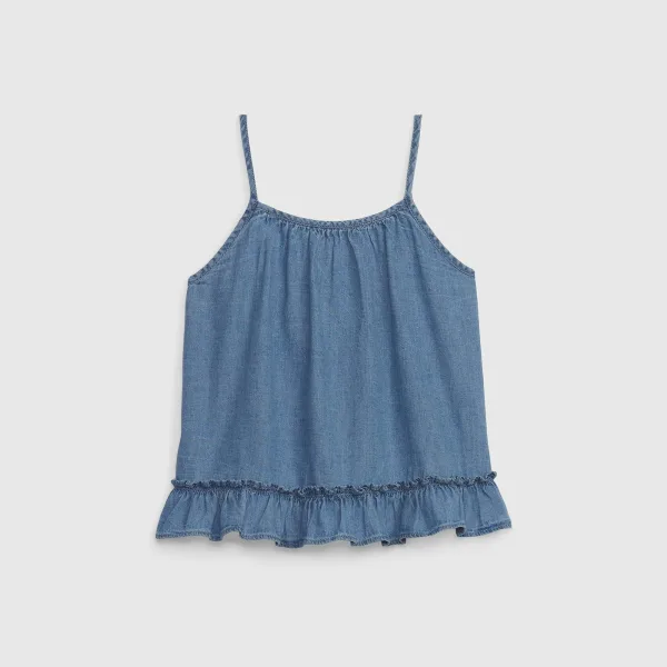 Mouwloze blouse voor meisjes van lichte denimstof, ideaal voor warme dagen. Het heeft verstelbare dunne bandjes en een gerimpelde ronde halslijn, die zorgen voor een delicate en vloeiende touch. Het ontwerp heeft een decoratieve ruche aan de zoom, voor een vrouwelijke en casual touch. Aan de achterkant heeft het een elegante overlay met knoopsluiting, wat het een leuke en dynamische look geeft. Deze blouse is perfect te combineren met shorts of rokken en is ideaal voor een casual en frisse look. Samenstelling: 100% katoen Onderhoud: - Machinewas koud. - Gebruik gelijkaardige kleuren in de was. - Vermijd het gebruik van bleekmiddelen. - Drogen op lage temperatuur in de droger. - Strijken op lage temperatuur. - Niet chemisch reinigen.