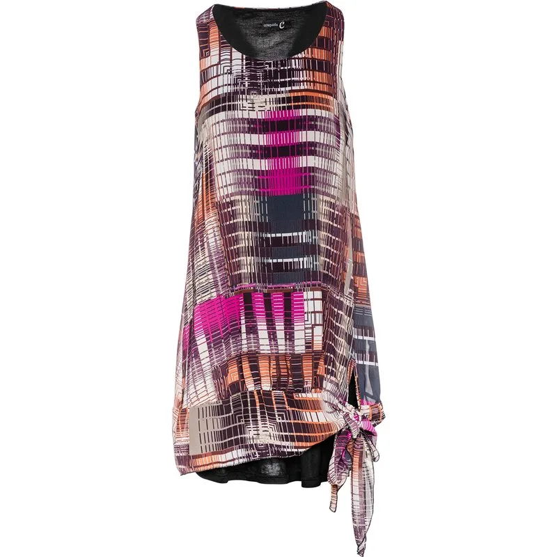 Mouwloze jurk met dubbele laag. De buitenste jurk is van bedrukte voilestof en de binnenste laag is van stretchjersey, viscose-elastaan. De twee lagen komen samen bij de hals. Ronde halslijn. De binnenste jurk heeft een A-lijn silhouet en is 6 cm langer dan de buitenste laag. De buitenste laag heeft een brede zoom van 12 cm die doorloopt in bandjes die aan de zijkant geknoopt worden. Gerimpeld boven de zoom. Afmetingen voor maat 36/S (in cm): Schouderbreedte-28, Buste-41, Taille-44, Zoomlijn-48. Lengte voor maat 36: 86cm/94cm respectievelijk buitenste en binnenste laag. 100% viscose