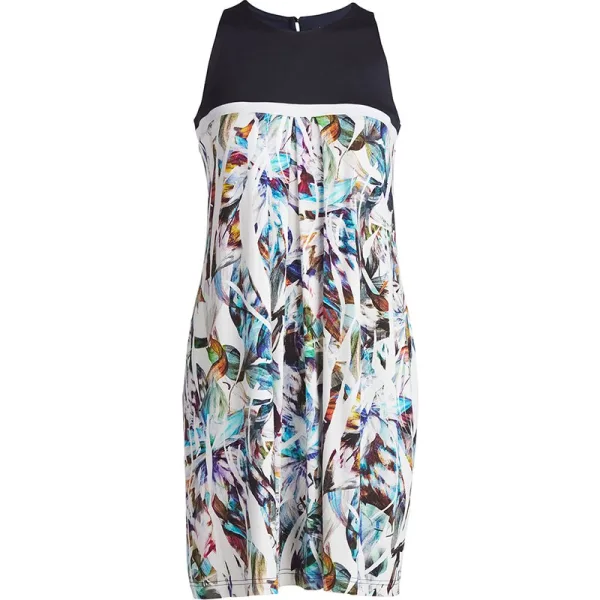 Jurk CONQUISTA van geprinte jerseystof onder de buste en stretchblauwe gabardinestof daarboven. Contrasterende witte strook onder de buste in gabardine. Plooien onder de buste geven de jurk meer wijdte. Mouwloos met racer schouders. Sluit op de rug met blauwe sierknopen. Lengte, voor maat 36/S, 96cm. 92% viscose-8% elastan. 92% viscose-8% elastan