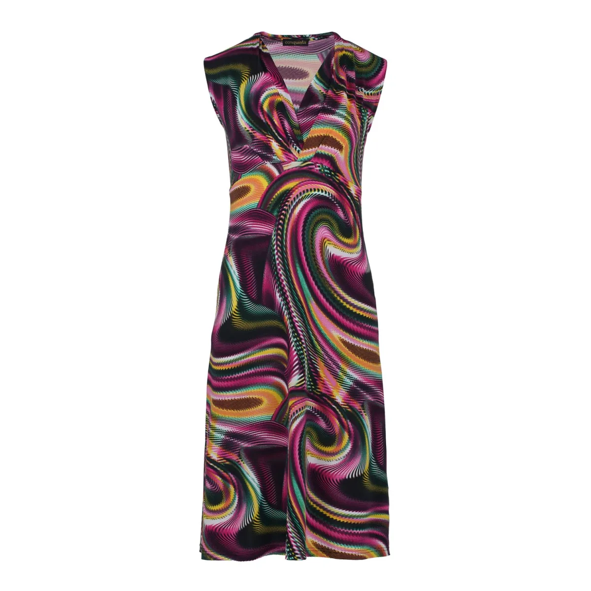 Zomerjurk van effen jersey met stretch. Mouwloos met een diepe V-hals met plooien links en rechts. Naaddetail onder de buste met plooien eronder. Riem van dezelfde stof aan de zijkanten vastgemaakt. Empire-lijn met een A-lijnsilhouet. Knielengte.