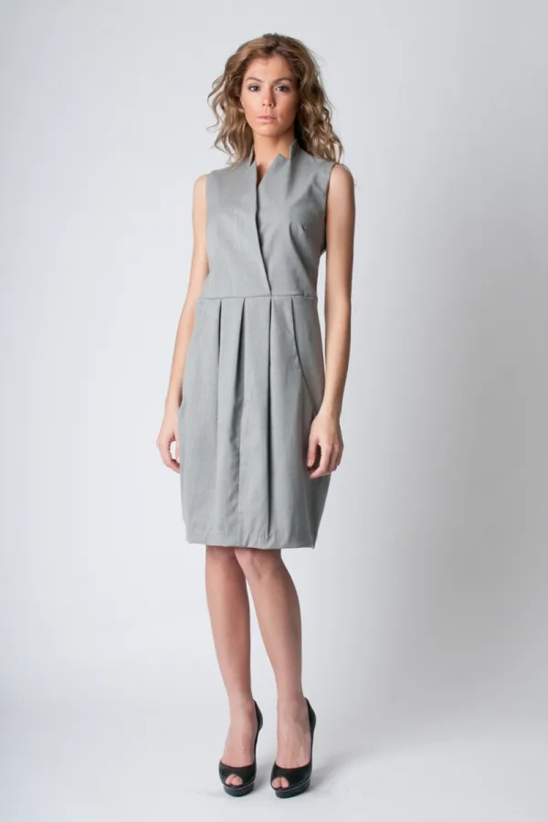 Deze mouwloze geweven jurk is een tijdloos chique stijl. Het heeft een opstaande kraag met V-hals en zijzakken.