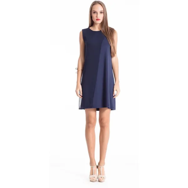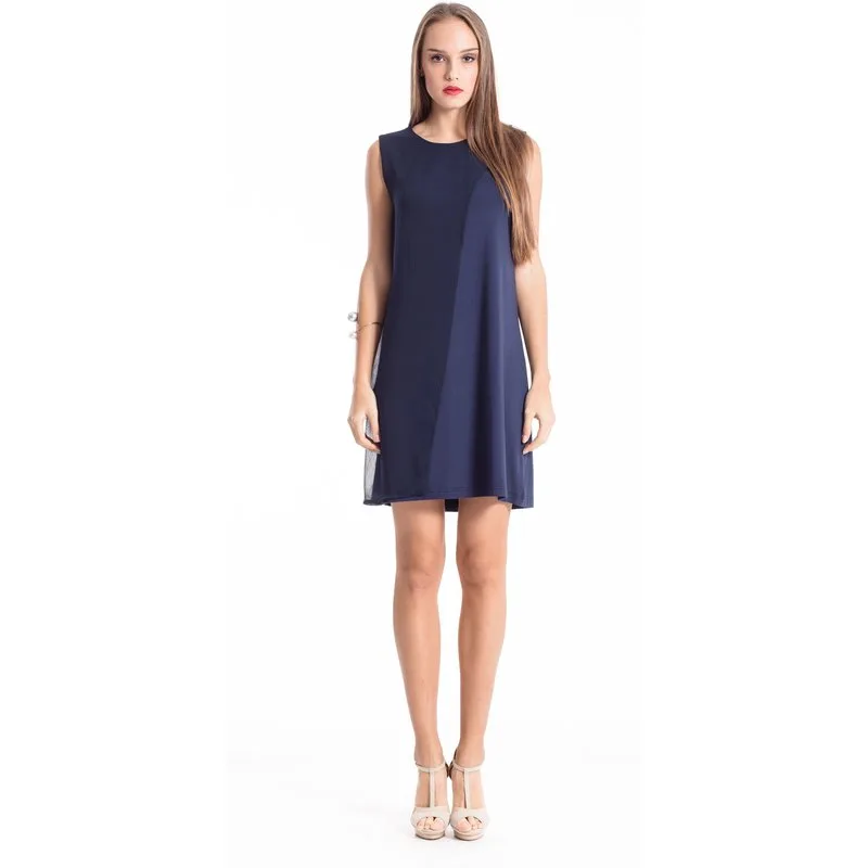 Maak een statement in deze eenvoudige maar stijlvolle mouwloze jurk van stretchjersey. Een asymmetrisch, transparant paneel tilt dit moeiteloze stuk naar een hoger niveau. Gemaakt in een gemakkelijke A-lijn voor een figuurflatterend silhouet. Het getoonde model is 178 cm en draagt maat 36/S. Jurk CONQUISTA in marineblauw van stretch viscose stof met een extra asymmetrisch sheer stuk aan de voorkant, ronde hals, mouwloos, A-lijn silhouet en lengte boven de knie.