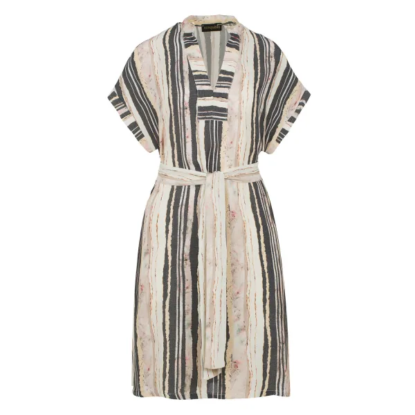 Deze zomerjurk met streepjesprint is gemaakt van geweven crêpe-viscose. Het is mouwloos en heeft een boord bij de armsgaten in dezelfde stof. Het heeft een mandarijnkraag van 2 cm en een sluiting van 4 cm bij de halslijn aan de voorkant om een V-vorm te creëren. Aan elke kant zit een binnenzak. De jurk heeft grote splitten van 20 cm aan elke kant. De jurk kan worden gedragen met de riem of zonder als u een meer ontspannen zakjurkstijl wilt creëren. De riem in dezelfde stof is inbegrepen. Dit kledingstuk is gestileerd in een recht los silhouet.