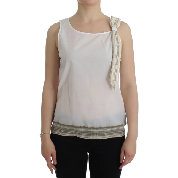 Verhoog, siert en boeit met deze prachtige mouwloze top. Gemaakt van een luxe katoenmix, biedt het een ademend gevoel en comfort de hele dag door. De flatterende ronde halslijn en relaxte pasvorm creëren een moeiteloos chique silhouet. Een unieke geplooide accent en delicate strikdetail op één schouder voegen een elegante touch toe, aangevuld met een subtiele gestreepte afwerking aan de onderrand. De onderhoudsvriendelijke constructie zorgt voor gemak. Perfect om naadloos over te gaan van casual uitjes naar semi-formele gelegenheden, dit veelzijdige stuk is een ware must-have voor je garderobe.