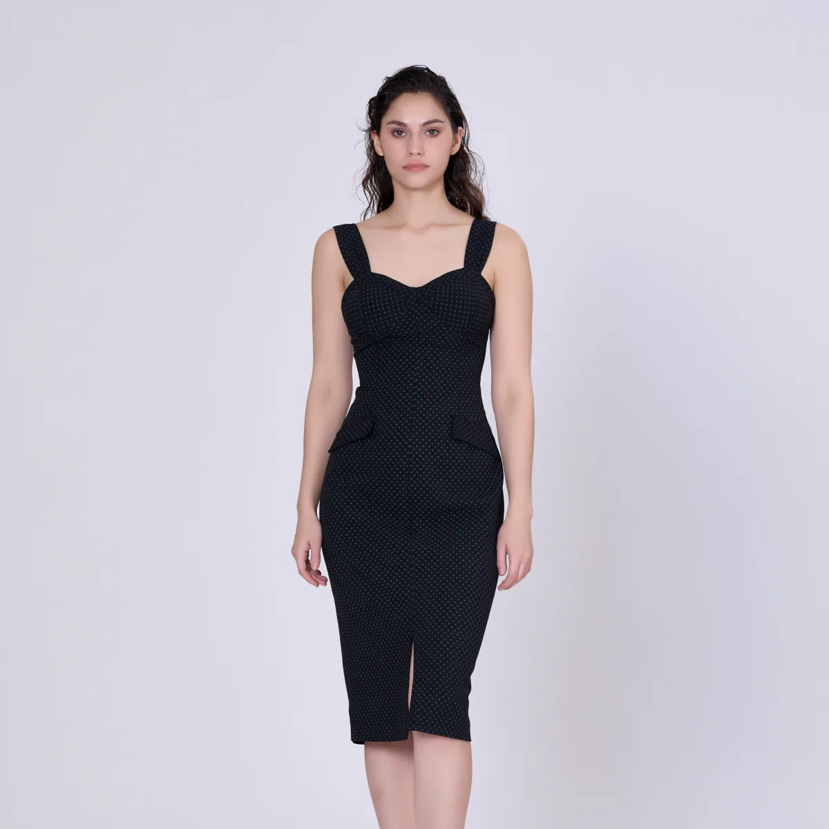 Een item gestructureerd met brede riemen op schouders en een hartvormige halslijn die als een bustier op de borst wordt gesneden. Een bodycon en aantrekkelijke potloodjurk die op de knieën naar beneden gaat met een spleet in de middelste voorste zoomlijn. Een enigszins retro -look met zijn lijn en zijn Mini Dots -stof. Kan worden gedragen voor semi-formele gelegenheid zoals een diner, een tuinfeest in de lente en zomer. Productdetails: Lengte: 92 cm Model draagt maat 10 Modelhoogte is 5 "7 Vorm: aangepast Schouderbanden Hartsplitsing Invisible Zipper Center Back