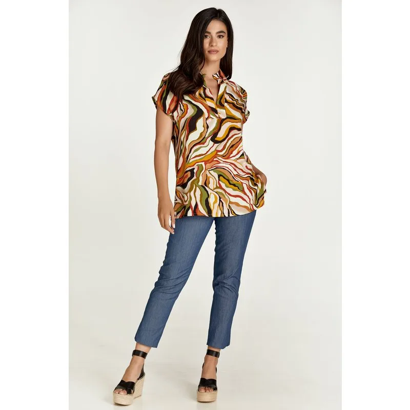 Specificaties: Mouwloze top met baksteenkleurige swirlprint