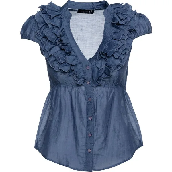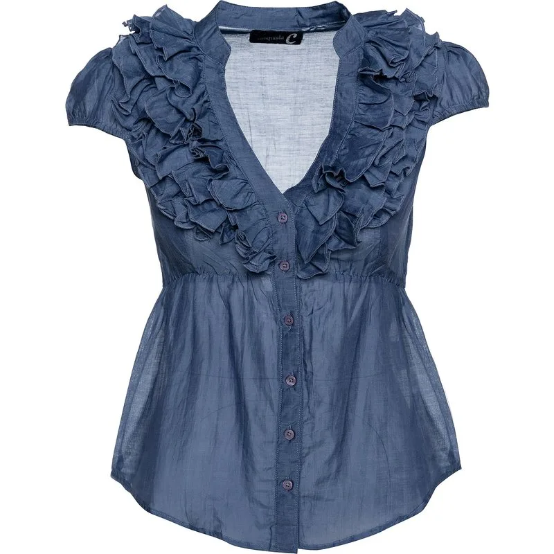 De subtiele ruches geven deze ultralichte blouse een vleugje romantiek. Elastisch onder het lijfje voor een meer getailleerde pasvorm. Dit kledingstuk zal zowel de broek als de rok vrouwelijker maken. Knoopsluiting aan de voorkant. Elastische kapmouwen.