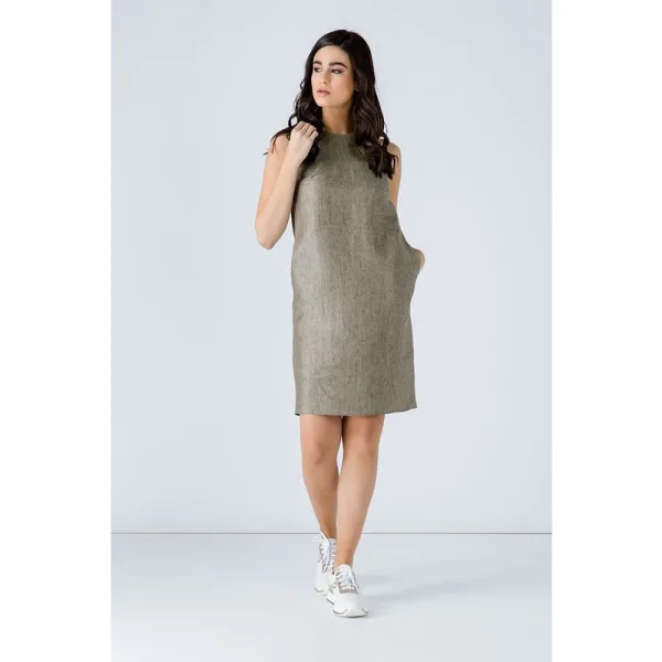 Zomerse zakjurk van geweven linnen gemêleerde stof. Ronde hals en mouwloos. Plooien op de borst en 2 zijzakken. Verborgen ritssluiting achteraan, toon op toon. Ons model is 172cm en draagt maat 36/S. Afmetingen voor maat 36 (in cm): Schouder -29; Borst-45; Taille-49; Onderkant-52; Lichaamslengte-95. 100% linnen