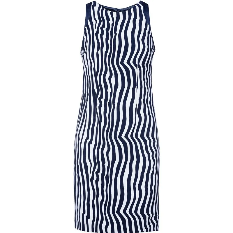 Jurk CONQUISTA in stretch jersey met zebraprint: polyester-elasthan. Mouwloos met een subtiel racerfront. Darts vooraan voor een perfecte pasvorm. Contrasterende panelen bij de armsgaten in stretch gabardine stof. Verborgen ritssluiting achteraan. Witte voering van stretch polyester. Lengte 96cm voor maat 36/S. Afmetingen voor maat 38/M (in cm):Schouderbreedte-26, Borst-38, Taille-40, Zoomlijn-44, Lichaamslengte-96. 92% polyester -8% elastan
