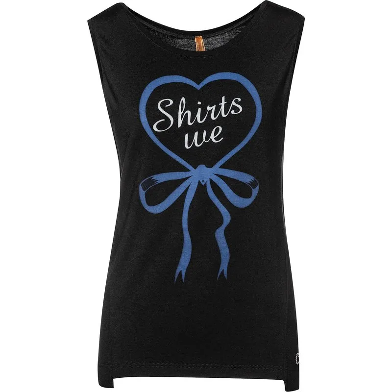 Mouwloze zomertop van zwarte jersey met stretch: micromodal-elastaan. Grijs met blauwe ‘Shirts We Love’-print aan de voorkant. Ronde hals. Ongelijke zoomlijn: 1 cm korter aan de voorkant. Decoratieve zilveren strass links aan de onderkant. Losse pasvorm. Afmetingen voor maat 36/S (in cm): schouderbreedte - 35, borst - 45, taille - 46, zoom - 48, lichaamslengte - 68. 92% micromodal - 8% elastaan.
