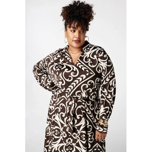 Deze lange MS Mode fit and flare jurk met paisley print is ideaal voor dagen waarop je er verzorgd uit wilt zien met weinig handelingen. De jurk valt tot op de enkel en heeft een A-lijn die soepel om het lichaam valt. Door de fit and flare pasvorm sluit de bovenkant licht aan en loopt de rok subtiel uit, wat zorgt voor een geaccentueerd silhouet.Details die het verschil maken Fit and flare model met A-lijn rok voor een elegante vorm Lange lengte van 136 cm in maat 46 Gemaakt van polyester, een materiaal dat vormvast is en zijn pasvorm behoudt tijdens het dragen Inclusief ceintuur in de taille voor extra accent op het middel Subtiele splitjes aan beide zijkanten voor extra bewegingsvrijheid Lange mouwen met rechte mouwinzet Klassieke kraag voor een verzorgde uitstraling Geen zakken en geen sluiting, de jurk wordt eenvoudig over het hoofd aangetrokken Geschikt voor machinewas, wat het onderhoud gemakkelijk maakt All-over paisley print in bruine tintenVoor werk, etentje of vrije dagDeze lange jurk is passend bij uiteenlopende momenten, zoals een werkdag, een diner of een ontspannen dagje uit. De paisley print geeft de jurk een bohemian stijl, terwijl de klassieke kraag zorgt voor een nette afwerking.MS Mode, met oog voor pasvormMS Mode richt zich op kleding met aandacht voor pasvorm in grotere maten. De ontwerpen zijn gemaakt zodat ze goed aansluiten op rondingen en voldoende ruimte bieden waar dat nodig is. Zo kies je voor kleding die geschikt is voor langdurig dragen.Een lange jurk waarmee je in één keer aangekleed bent, van eerste afspraak tot laatste moment van de dag.
