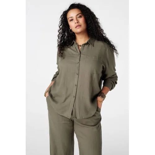 Deze lichtkaki linnen blouse voor dames van MS Mode is een luchtige basic voor warme dagen. Het ruimvallende model valt soepel om het lichaam, met een lengte van 75cm in maat 46. De mix van 55% linnen en 45% viscose voelt prettig aan en is geschikt voor dagelijks gebruik in het zomerseizoen. De blouse heeft een klassieke kraag, lange rechte mouwen en een doorknoopsluiting aan de voorkant.Luchtig model met praktische details Gemaakt van 55% linnen en 45% viscose voor een frisse, ademende touch Ruimvallende pasvorm, geschikt als comfortabele blouse in grote maten Lengte 75cm in maat 46 voor een mooi vallend, iets langer silhouet Lange mouwen die je kunt opstropen en vastmaken met een knoopsluiting Borstzakje aan de voorkant voor een subtiel detail Effen lichtkaki kleur, makkelijk te combineren Knoopsluiting over de hele lengte voor flexibel draaggemak Machinewas, dus eenvoudig te onderhoudenVeelzijdig in je dagelijkse garderobeDeze blouse uit de 'Daily' collectie past goed in een casual garderobe. Je kunt de blouse los over een broek of legging dragen, of deels ingestopt. Er is ook een bijpassende broek in dezelfde stijl beschikbaar.MS Mode voor comfortabele stijl in grote matenMS Mode richt zich op dames met een grotere maat en combineert modieuze ontwerpen met comfortabele pasvormen. De collecties sluiten aan op het dagelijks leven, met aandacht voor draagcomfort, praktische details en een toegankelijke stijl.Een luchtige, ruime blouse voor zomerse dagen.
