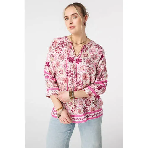 Geef je dagelijkse look een frisse update met deze MS Mode viscose blouse met bloemenprint. De blouse is gemaakt van 100% viscose, waardoor de stof soepel langs het lichaam valt en prettig aanvoelt op de huid. De vrolijke multi pink bloemenprint en de klosjes aan de V-hals zorgen voor een speels detail. Dankzij de A-line pasvorm valt de blouse losjes om het lichaam, wat extra bewegingsvrijheid geeft.Verfijnde details voor elke dag A-line pasvorm die losjes langs het lichaam valt Lengte van 72 cm in maat 46, ideaal om over een broek of rok te dragen Driekwart mouwen met elastiek voor een lichte, bloezende look Klassieke kraag en volledige knoopsluiting aan de voorkant Gemaakt van 100% viscose voor een soepele, luchtige touch Machinewas voor eenvoudig onderhoud Onderdeel van de grote maten collectie van MS ModeVeelzijdig te combineren blouseDeze blouse past goed bij je dagelijkse garderobe. Combineer met een donkere jeans voor een ontspannen dagoutfit of draag de blouse op een nette broek voor een meer geklede look. De driekwart mouwen maken dit model geschikt voor het lente seizoen en voor binnen het hele jaar door.MS Mode, specialist in grote matenMS Mode richt zich op dames met een maatje meer en ontwerpt kleding met aandacht voor pasvorm en draaggemak. De collecties bieden modieuze items voor alledag, waarbij comfort en een prettige snit centraal staan. Zo voeg je makkelijk nieuwe favorieten toe aan je kast.Een blouse die je keer op keer uit de kast pakt voor een verzorgde en vrouwelijke look.