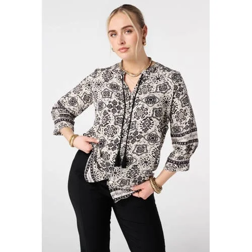 Deze luchtige dames blouse met bloemenprint in grote maten van MS Mode is een praktische basis voor elke dag. De soepele stof valt losjes langs het lichaam en beweegt licht met je mee. De zwart / ecru print maakt het eenvoudig om de blouse te combineren met een jeans, nette broek of een rok, zodat je snel een complete look hebt.Details die het verschil maken Gemaakt van 100% viscose, een zachte stof met een gladde touch A-lijn pasvorm die losjes om het lichaam valt voor extra comfort Driekwart mouwen met elastiek voor een lichte poffende look Klassieke kraag en knoopsluiting over de hele lengte V-hals met decoratieve klosjes voor een speels accent Lengte 72 cm in maat 46, prettig over de heupen vallend Geschikt voor machinewas, handig in het dagelijks onderhoud Bloemenprint in zwart / ecru die eenvoudig te stylen isElke dag een verzorgde outfitDeze blouse komt uit de 'Daily' collectie en is ideaal voor momenten waarop je er verzorgd uit wilt zien zonder veel gedoe. Draag de blouse los over een smalle broek of stop de voorkant licht in de tailleband voor een meer geklede uitstraling. De luchtige stof en ruime pasvorm maken het ook op warmere dagen een praktische keuze.MS Mode voor grote matenMS Mode richt zich op mode in grote maten met aandacht voor pasvorm, comfort en vrouwelijke lijnen. De collecties zijn ontworpen om goed aan te sluiten op rondingen, met doordachte lengtes en modellen die prettig zitten. Zo kies je voor kleding waarin je je de hele dag op je gemak voelt.Een blouse met bloemenprint waar je in het dagelijks leven veel plezier van hebt.
