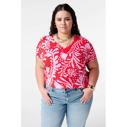 Fris je dagelijkse garderobe op met dit luchtige MS Mode T-shirt met blad- en bloemenprint. De soepele viscosemix valt mooi recht langs het lichaam en geeft een comfortabele uitstraling zonder te strak te zitten. De V-hals en korte mouwen zorgen voor een open, vrouwelijke look die eenvoudig te combineren is met je favoriete jeans, rok of korte broek.Details die je elke dag graag draagt Rechtvallende pasvorm die rond taille en heupen losjes langs het lichaam valt Lengte van 70 cm in maat L, fijn als je net wat meer bedekking rondom heupen wilt V-hals die het decolleté subtiel accentueert en het bovenlichaam optisch verlengt Korte, rechte mouwen voor een luchtig gevoel op warmere dagen Gemaakt van zachte viscose met stretch voor extra bewegingsvrijheid Rode basis met blad- en bloemenprint voor een levendige, maar rustige uitstraling Geschikt voor machinewas, handig in het dagelijkse wasritmeIdeaal voor dagelijkse looksDit T-shirt uit de Daily collectie is een fijne basis voor alledaagse outfits in het lente seizoen en daarbuiten. Combineer het met een lichte denim, een comfortabele broek of een effen vest om de print mooi tot zijn recht te laten komen.MS Mode, gespecialiseerd in pasvormMS Mode richt zich op modieuze kleding met aandacht voor pasvorm en comfort. De collecties zijn ontworpen zodat je je prettig voelt in wat je draagt, met doordachte lengtes en modellen die het lichaam mooi volgen.Een luchtig T-shirt dat je zo uit de kast pakt wanneer je kiest voor gemak, comfort en een frisse print.