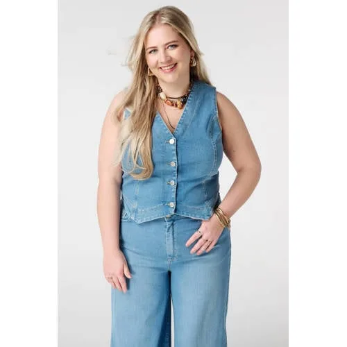 Dit lichtblauwe denim gilet voor dames van MS Mode is een veelzijdige toevoeging aan je garderobe. Het spijker gilet heeft een aangesloten pasvorm en een middel-lange lengte, waardoor het mooi aansluit op je figuur zonder in te leveren op bewegingsvrijheid. De lichte wassing geeft een frisse uitstraling die perfect past bij het voorjaar en de zomer. Het gilet is mouwloos en afgewerkt met een reverskraag en knoopsluiting, wat zorgt voor een nette, maar toch ontspannen look.Details die het verschil maken Gemaakt van 98% katoen / 2% elastaan voor een zachte stof met lichte stretch Lichte 'light blue denim' kleur voor een frisse en tijdloze uitstraling Aangesloten pasvorm die het lichaam volgt Lengte: 52cm in maat 46, valt op de heup voor een mooie verhouding Reverskraag en knoopsluiting voor een verzorgde, gelaagde look Machinewas, dus eenvoudig te onderhouden Onderdeel van de ROSE KLERENZOOI x MS Mode collectie in de lichte variantGemakkelijk te stylen in jouw dagelijkse outfitsDit spijker gilet past bij veel verschillende stijlen. Draag het over een T-shirt of top en combineer met een jeans voor een volledige denim-look. Liever wat gekleder? Dan staat het gilet ook mooi op een pantalon of een nette broek. Door het mouwloze model is het ideaal als extra laagje in het voorjaar en op frissere zomerdagen.MS Mode: specialist in grote matenMS Mode richt zich op dames met een grotere maat en ontwerpt kleding met aandacht voor pasvorm en comfort. De collecties zijn afgestemd op dagelijkse draagmomenten en sluiten aan bij modetrends, zodat je kleding kiest die goed zit en er verzorgd uitziet. Dit denim gilet past binnen die visie en biedt een stijlvol item voor elke dag.Een modern spijker gilet dat je eenvoudig combineert en vaak uit de kast pakt.