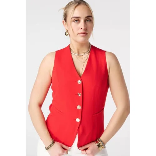 Geef je outfit een nieuwe look met dit rode gilet van MS Mode. Het langere model valt over de heupen en creëert een rustig geheel over tops, blouses of jurken. De diepe V-hals legt de nadruk op je halslijn en maakt het gilet geschikt om te combineren met een basic T-shirt of een top met kant.Kenmerken die dit gilet bijzonder maken Lang model met een lengte van 67 cm in maat 46 voor extra bedekking Aansluitende pasvorm die je silhouet volgt zonder te knellen Met gouden knoopsluiting aan de voorkant Mouwloos ontwerp, prettig op warme dagen en handig om te layeren Effen rode kleur die makkelijk combineert met zwarte, witte of denim items Sierzakken aan de voorkant in blazerstijl Geschikt voor dagelijks gebruik dankzij het soepele materiaal met lichte stretch Eenvoudig te onderhouden, want het gilet kan in de wasmachineRood gilet voor dagelijkse en zomerse looksDit gilet komt uit de Daily collectie en is geschikt voor zomerse dagen of een warme werkdag. Draag het open over een luchtige blouse voor een casual look of gesloten met de knoopsluiting voor een formelere uitstraling. Ook passend over een rechte jurk, voor een complete set.MS Mode voor jouw dagelijkse garderobeMS Mode richt zich op kleding met een pasvorm in grotere maten. De collecties zijn ontworpen om goed aan te sluiten op het dagelijks leven, met items die prettig aanvoelen en een rustige basis vormen voor je outfit. Zo stel je eenvoudig combinaties samen die je de hele dag graag draagt.Een gilet dat je garderobe direct meer combinatiemogelijkheden geeft.