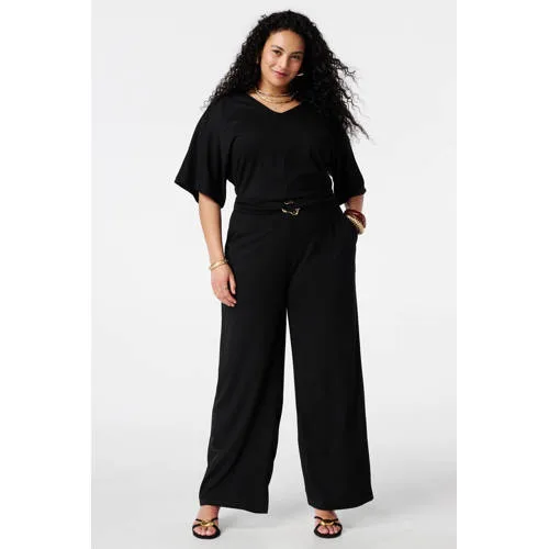 Ga voor moeiteloze elegantie met deze zwarte dames jumpsuit in grote maten van MS Mode. Het model heeft een wide leg pasvorm, waardoor de pijpen mooi recht en wijd langs je benen vallen. De luchtige stof voelt soepel aan en beweegt makkelijk met je mee, ideaal voor een lange werkdag of een avond uit.Verfijnde details en comfortabele pasvorm Wide leg model dat de benen optisch verlengt Klassieke kraag en ritssluiting aan de voorkant voor een nette uitstraling Kapmouwen die de schouders subtiel bedekken Ceintuur in de taille met een gouden knoop voor een mooi silhouet Zijzakken voor extra praktisch gemak Binnenbeenlengte: 77cm in maat 46 Soepel vallende stof met lichte stretch voor bewegingsvrijheidVan werkdag tot etentjeDeze zwarte jumpsuit past goed in je dagelijkse garderobe. Combineer met nette loafers of enkellaarsjes voor een werkdag, of kies voor hakken en sieraden voor een diner. De effen kleur maakt het eenvoudig om te stylen met een blazer of een kort jasje wanneer het frisser is in de lente.MS Mode, expert in grote matenMS Mode richt zich op dames met curves en een grotere maat, met aandacht voor pasvorm en draaggemak. De collectie bestaat uit kleding die je elke dag kunt dragen, afgestemd op verschillende gelegenheden. Met deze jumpsuit haal je een doordacht ontworpen item in huis dat stijl combineert met comfort.Een tijdloze keuze voor dagen waarop je graag in één keer goed gekleed de deur uit gaat.