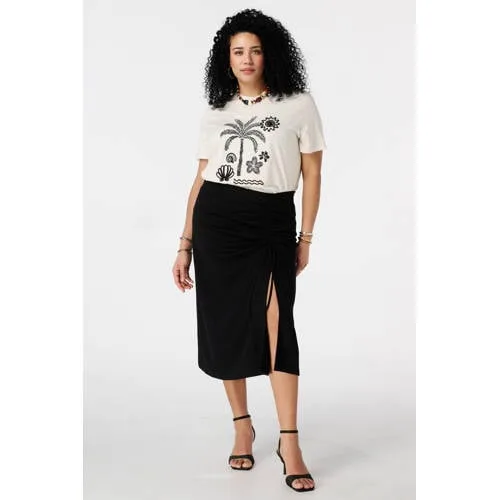 Deze zwarte midi rok voor dames van MS Mode is een veelzijdig item voor elke dag. De rok heeft een middelhoge taille en een A-lijn pasvorm die soepel om je heen valt. Gemaakt van een luchtige stof met viscose en elastaan, waardoor het materiaal zacht aanvoelt en fijn meebeweegt. Het samengetrokken detail aan de zijkant zorgt voor een speels effect en laat de voorkant subtiel plooien.Verfijnde details voor elke dag Midi lengte van 80cm in maat 46, ideaal tussen knieën en kuiten A-lijn pasvorm die mooi rond je heupen valt Soepel vallende stof met stretch voor extra draagcomfort Samengetrokken detail aan de zijkant dat de voorkant licht laat plooien Split aan de voorkant voor extra bewegingsvrijheid Regular waist en geen sluiting, je trekt de rok eenvoudig aan Effen zwarte kleur, makkelijk te combineren met tops en blouses Onderdeel van het grote maten assortiment, afgestemd op curvy vormen Geschikt voor machinewas, praktisch in het dagelijks gebruikMakkelijk combineren, van casual tot netjesVoor een relaxte dag combineer je de rok met een T-shirt en sneakers. Wil je netter voor de dag komen, dan is een blouse of fijn breisel met laarsjes een goede keuze. Door de midi lengte en de effen kleur past deze rok goed in je dagelijkse garderobe, van werkdag tot etentje.MS Mode: stijlvol voor grote matenMS Mode richt zich op dames met vrouwelijke vormen en biedt kleding in grote maten die goed aansluit en prettig zit. Met aandacht voor pasvorm, mooie details en praktische stoffen zorgt MS Mode voor mode die je makkelijk draagt in het dagelijks leven.Een veelzijdige rok die je garderobe direct meer mogelijkheden geeft.