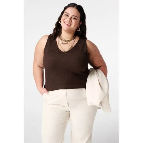 Deze donkerbruine MS Mode singlet is een praktische basic voor allerlei outfits. De mouwloze top heeft een subtiele structuur in de stof, waardoor je outfit net wat meer uitstraling krijgt. Onder een blazer naar je werk, met een openvallend vest op een vrije dag of gewoon zo op een warme lentedag, deze top past makkelijk in jouw garderobe. De aansluitende pasvorm volgt je vormen op een zachte en comfortabele manier.Verfijnde basic met structuur Mouwloze top met ronde hals, geschikt als basislaag of los te dragen Zichtbare textuur in de stof voor een rustige uitstraling met subtiel effect Aansluitende pasvorm die langs het lichaam valt Lengte circa 70 cm in maat L, prettig voor wie graag wat extra lengte wil Soepel materiaal met elastaan voor lichte stretch en draagcomfort Effen donkerbruine kleur, makkelijk te combineren met jeans, rok of nette broek Geen sluiting, je trekt de top eenvoudig over het hoofd aan Geschikt voor machinewas, prettig in het dagelijks onderhoudVoor alledaags gebruik en laagjeslooksDeze singlet uit de 'Daily' collectie is ontworpen voor elke dag. Draag de top onder een blazer voor een nette look op kantoor of combineer met een luchtig vest en een wijde broek voor een ontspannen outfit. In de lente en zomer komt de mouwloze snit extra goed tot zijn recht.MS Mode, gespecialiseerd in grote matenMS Mode richt zich op kleding in grote maten, met oog voor pasvorm en draaggemak. De collectie is ontworpen zodat jij je comfortabel kunt voelen in kleding die prettig valt. Deze singlet sluit daar goed op aan, als betrouwbare basic in jouw dagelijkse garderobe.Een comfortabele top die in veel outfits past en vaak van pas komt.