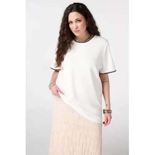 Dit MS Mode T-shirt voor dames is een fijne basic voor elke dag, met een subtiel detail dat het net wat speelser maakt. De luchtige stof voelt comfortabel aan, ook op warmere dagen, en de rechte pasvorm valt soepel langs het lichaam. Door de crème kleur met donker accent bij de randen combineer je het shirt gemakkelijk met je favoriete jeans, zwarte broek of een comfortabele legging.Details die het verschil maken Sierstiksels langs de hals en mouwranden voor een speelse uitstraling Luchtige kwaliteit die prettig voelt op de huid Rechtvallend model dat mooi langs het lichaam valt Lengte van 72 centimeter in maat L, fijn voor wie wat extra lengte wil Korte mouwen en ronde hals voor een tijdloze, casual look Bevat 48% viscose en 6% elastaan voor een soepele stof met lichte stretch Machinewas, handig in het dagelijks gebruik Crème kleur met zwart detail, eenvoudig te combinerenIdeaal voor elke dagDit T-shirt komt uit de Daily collectie en past goed in een garderobe voor alledag. Draag het losjes over een broek voor een ontspannen look of stop de voorkant nonchalant in je tailleband. De rechte mouwen en ronde hals zorgen voor een rustige basis die je makkelijk aanvult met een vest of jasje.MS Mode: stijlvol in grote matenMS Mode richt zich op modieuze kleding in grote maten, met aandacht voor pasvorm en draaggemak. De collecties zijn afgestemd op het dagelijks leven, zodat je er verzorgd uitziet en je vrij kunt bewegen. Met dit T-shirt haal je een betrouwbaar basic item in huis waar je vaak naar zult grijpen.Een praktische, luchtige topper voor dagen waarop je moeiteloos gekleed wilt zijn.