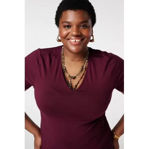 Dit donkerrode MS Mode T-shirt dames is een basic T-shirt voor elke dag met een zachte touch. De rechte pasvorm valt soepel om je lichaam en biedt voldoende ruimte, ook bij grotere maten. Dankzij de V-hals ontstaat een open halslijn die goed combineerbaar is onder een vest of blazer, en ook solo draagbaar is. De zachte stof met stretch beweegt met je mee, zodat je je de hele dag vrij kunt bewegen.Fijne basic voor elke dag Donkerrode kleur die combineert met denim, zwart en neutrale tinten V-hals voor een open halslijn Korte, rechte mouwen voor extra ventilatie rond de armen Rechtvallende pasvorm, passend bij het grotere maten assortiment Lengte van 70 cm in maat L voor een heuplengte Zachte, soepele stof met elastaan voor extra bewegingsvrijheid Geschikt voor machinewas, praktisch voor dagelijks gebruikComfortabel in je daily lookDit T-shirt hoort bij de 'Daily' collectie en past gemakkelijk in je vaste garderobe. Draag het op een jeans voor een casual dag, onder een lang vest voor extra laagjes of in een nette broek voor een comfortabele werkoutfit. De effen uitvoering maakt het een eenvoudige basis die lang bruikbaar blijft.MS Mode, specialist in grote matenMS Mode richt zich op vrouwen met rondingen. De pasvormen zijn ontwikkeld met aandacht voor grotere maten, zodat shirts, broeken en jurken goed aansluiten en voldoende ruimte bieden. Met dit T-shirt haal je een praktisch basisitem in huis dat aansluit bij de ervaring en kennis van MS Mode in grote maten mode.Een comfortabele basic waar je vaak naar grijpt bij je dagelijkse outfits.