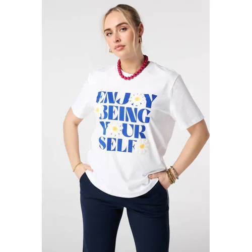 Voor een relaxte dag waarop je er toch verzorgd uit wilt zien, is dit T-shirt van MS Mode geschikt. De rechte pasvorm valt losjes langs je lichaam en geeft een comfortabel gevoel, zonder te strak te zitten. De wit/blauwe basis met tekstprint op de voorkant zorgt voor een frisse, dagelijkse look die je eenvoudig combineert met jouw favoriete jeans of korte broek.Comfort voor elke dag Gemaakt van 100% katoen, een zachte stof die prettig aanvoelt op de huid Rechtvallend model dat soepel langs je lichaam valt Lengte van 65 cm in maat L, ideaal om zowel in als over je broek te dragen Korte mouwen en ronde hals voor een luchtig en tijdloos silhouet Voorzijde met tekstprint in blauw op de borst Geschikt voor machinewas, praktisch in het dagelijks gebruikCasual zomerse look samenstellenDit T-shirt komt uit de dagelijkse zomercollectie en past bij een ontspannen, alledaagse stijl. Draag het met een blauwdenim jeans en sneakers voor een casual outfit of combineer met een soepel vallende broek voor extra comfort.MS Mode, gespecialiseerd in vrouwelijke vormenMS Mode richt zich op vrouwen met vrouwelijke vormen en grotere maten. De pasvormen worden ontworpen met aandacht voor comfort, bewegingsvrijheid en een goede aansluiting rond buste, taille en heupen. Met dit T-shirt haal je een kledingstuk in huis dat is ontwikkeld voor jouw figuur.Een T-shirt dat jouw zomerse garderobe aanvult.