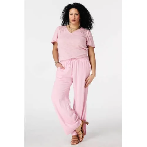 Deze roze dames top met vlindermouwen van MS Mode is een basis voor elke dag, met subtiele details voor alledaags gebruik. De vlindermouwen vallen losjes om je armen en geven extra bewegingsvrijheid. De rechtvallende pasvorm en lengte van 70 centimeter in maat L zorgen voor een relaxed silhouet en comfort tijdens je dagelijkse bezigheden.Fijne details voor elke dag Vlindermouwen die luchtig rond je armen vallen Kanten details langs de hals en op de rug voor een verfijnde afwerking Rechtvallend model dat comfortabel om het lichaam valt V-hals die de halslijn duidelijk laat uitkomen Effen roze kleur, goed te combineren met je favoriete broeken en rokken Geschikt voor de Daily collectie en ideaal voor het voorjaar Machinewas, waardoor de top eenvoudig te onderhouden is Onderdeel van het grote maten assortiment van MS ModeZo draag je deze roze topDe top is een rustige basis voor allerlei outfits. Combineer met een donkere jeans voor een alledaagse look of met een lichte broek voor een frisse lentecombinatie. De korte mouwen maken het een prettig item voor warme dagen, en op koelere momenten draag je er gemakkelijk een vest of blazer overheen.MS Mode voor pasvorm en comfortMS Mode richt zich op mode in grote maten, met aandacht voor pasvorm en draaggemak. Iedere collectie wordt ontworpen om goed aan te sluiten op het lichaam en toch ruimte te geven om vrij te bewegen. Zo voeg je met deze top een praktisch item toe aan je kledingkast.Een comfortabele basic met subtiele details die je makkelijk in verschillende combinaties gebruikt.