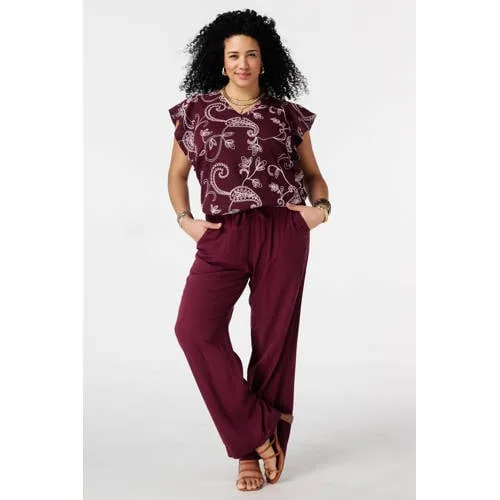 Deze donkerrode paisley top voor dames is een luchtige keuze voor zomerse dagen. De all over paisleyprint in donkerrood/ecru valt direct op, terwijl de structuur in de stof voor een speels effect zorgt. De ballonpasvorm met elastische band in de taille geeft een blousend silhouet dat soepel om het lichaam valt. De V-hals en mouwloze schouders met fladdermouwen en ruches maken de top vrouwelijk en comfortabel tegelijk.Details van deze paisley top Ballonpasvorm met elastische band in de taille voor een blousend effect All over paisleyprint in donkerrood/ecru voor een karaktervolle uitstraling Lengte 70 centimeter in maat L, prettig bij een broek of rok met hoge taille V-hals die het decolleté subtiel accentueert Mouwloos ontwerp met fladdermouwen en ruches voor extra beweging Soepel materiaal met structuur dat prettig aanvoelt op de huid Bevat 2% Spandex voor een lichte stretch en meer draagcomfort Geschikt voor machinewas, handig in het dagelijks gebruikZomerse combinaties met deze topDoor de lengte en ballonpasvorm combineer je deze top eenvoudig met een slim fit broek of een rechte rok. De donkerrode tint sluit goed aan bij neutrale kleuren zoals zwart, ecru of denim. Ideaal voor een werkdag, een dagje stad of een etentje op een terras in de zomer.MS Mode en pasvorm in grote matenMS Mode richt zich op dames met een maatje meer en ontwikkelt collecties waarin pasvorm centraal staat. De lijnen zijn afgestemd op rondingen, zodat de kleding prettig zit en mooi valt. Binnen de Daily collectie vind je items zoals deze top, die geschikt zijn voor alledaagse momenten en makkelijk te combineren zijn met je bestaande garderobe.Een comfortabele en zomerse toevoeging aan je garderobe waarmee je elke dag weer verzorgd voor de dag komt.