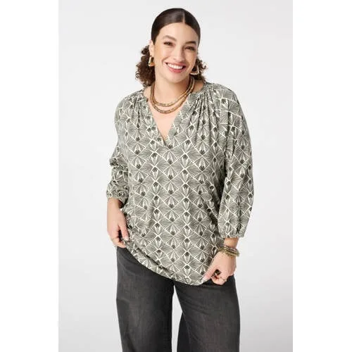 Geef je outfit direct meer uitstraling met deze MS Mode viscose top met all over print. De vrouwelijke pasvorm in A-lijn valt soepel om je lichaam en zorgt voor een mooi vallend silhouet. De V-hals legt subtiel de nadruk op je halslijn, terwijl de speelse print je look net wat levendiger maakt. Een fijne basic voor elke dag, die tegelijk genoeg detail heeft om solo te dragen.Details die het verschil maken A-lijn pasvorm die losjes langs je heupen valt voor een flatterend effect V-hals voor een open, vrouwelijke uitstraling All over print die je outfit in één keer afmaakt Lange, rechte mouwen met elastiek onderaan voor extra draaggemak Lengte van ongeveer 75 cm in maat L, ideaal om over een jeans of pantalon te dragen Gemaakt van 95% viscose en 5% elastaan voor een soepele stof met lichte stretch Machinewasbaar, waardoor je de top eenvoudig in je wekelijkse wasroutine meeneemtMakkelijk combineren in elke stijlDe lengte tot over de heupen maakt deze top geschikt om los te dragen over een strakke jeans, coated broek of nette pantalon. Door de A-lijn pasvorm zit er genoeg ruimte rond de buik en heupen, wat ook prettig is tijdens een drukke dag. Draag de top met sneakers voor een casual look of met hakken voor een meer geklede combinatie.MS Mode als vertrouwde favorietMS Mode richt zich op modieuze items met aandacht voor pasvorm en comfort. De collecties worden ontworpen met het dagelijks leven in gedachten, zodat je je de hele dag comfortabel en zelfverzekerd voelt in je kleding.Een stijlvolle, draagbare top die je makkelijk pakt als je snel een complete look wilt creëren.