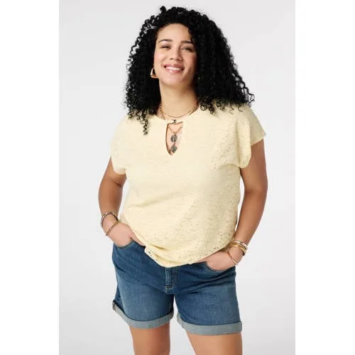 Deze lichtgele kanten top voor dames van MS Mode is een fijne basic voor elke dag. De top heeft korte mouwen, een ronde hals en valt recht langs het lichaam. De lengte van 70cm in maat L zorgt dat de top prettig over de heupen valt. De subtiele cut-out in de hals met een goudkleurige bedel geeft net wat extra detail, zonder te druk te worden.Details die het verschil maken Kanten bovenlaag voor een vrouwelijke uitstraling Cut-out bij de hals met goudkleurige bedel als eyecatcher Rechtvallende pasvorm, comfortabel en makkelijk te stylen Korte rechte mouwen, ideaal voor het lente seizoen Lichtgele kleur die goed combineert met denim, wit en neutrale tinten Lengte 70cm in maat L, prettig voor een wat meer bedekkende look Gemaakt van katoen met stretch voor een zachte feel en extra draagcomfort Effen ontwerp, gemakkelijk te combineren met een rok of broekIdeaal voor jouw daily looksDeze top komt uit de 'Daily' collectie en is ontworpen voor alledaags gebruik. Draag de top op een jeans voor een ontspannen dag of combineer met een nette broek voor een meer geklede outfit. De machinewasbare kwaliteit maakt onderhoud eenvoudig.MS Mode: gespecialiseerd in grote matenMS Mode richt zich al jaren op mode in grote maten, met aandacht voor pasvorm en comfort. De collecties zijn afgestemd op vormen en maten die extra ondersteuning en een prettige fit vragen. Zo kies je voor kleding die goed zit en waar je elke dag op kunt rekenen.Een veelzijdige top waarmee je eenvoudig verschillende outfits samenstelt.