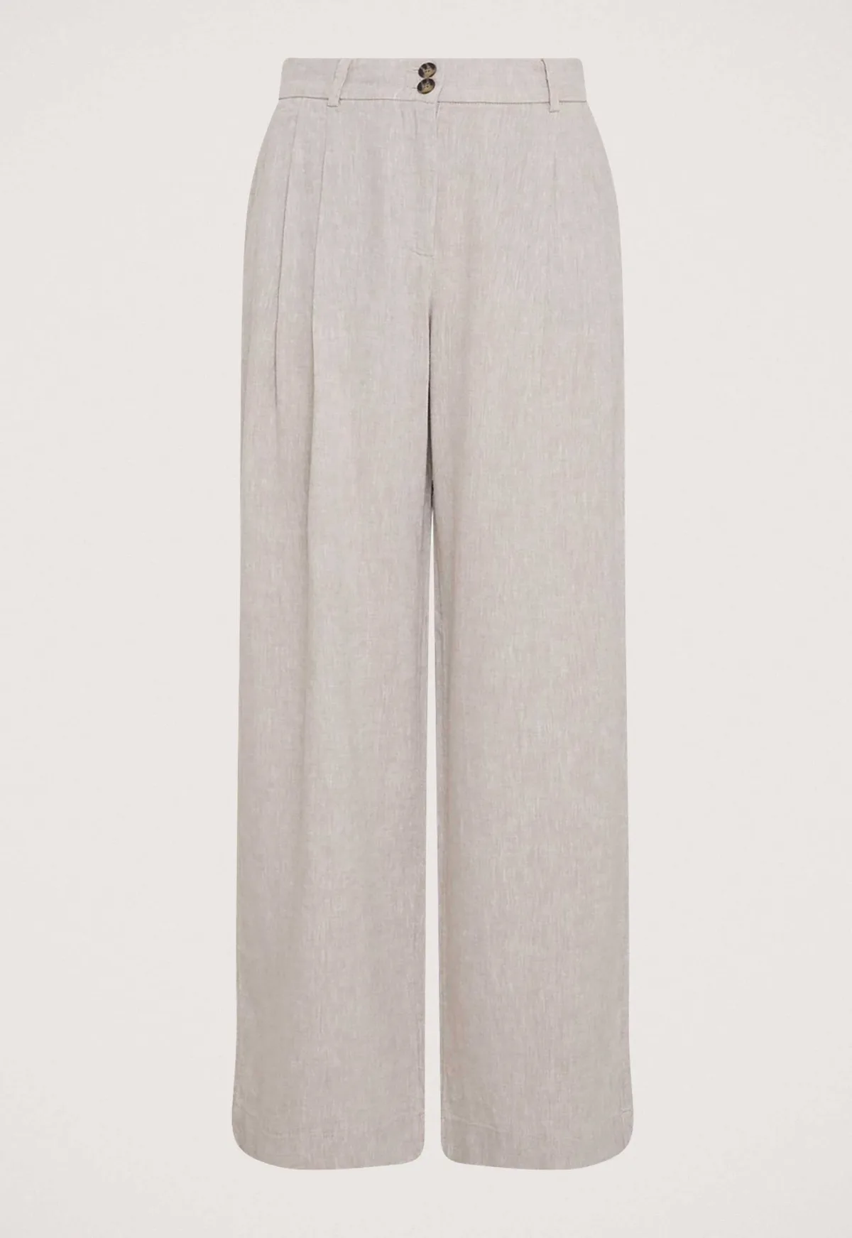 Dit is de Viana Ginia Pleat Pants van het merk Msch Copenhagen. Deze regular fit broek, uitgevoerd in linnenmix (55% linnen en 45% viscose), heeft een stijlvolle uitstraling dankzij de wijde rechte pijpen en een hoge taille. De broek is voorzien van een rits- en dubbele knoopsluiting aan de voorkant, aangevuld met praktische riemlussen en een decoratieve achterzak. Het lichte linnenmateriaal maakt deze broek ideaal voor warme dagen, terwijl de elegante pasvorm zorgt voor veelzijdige stylingopties.