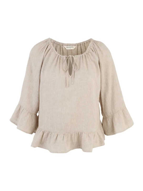Blouse type: Blouseshirt; Design: Gevoerde zoom/rand, Om te knopen/binden; Materiaal: Linnen; Motief: Mélange; Kraag: Tuniek kraag; Details: Volant, Gedrapeerd; Extra's: Op staal naden, Luchtige stof; Pasvorm: Losse pasvorm; Armlengte: Driekwart mouw; Lengte: Normale lengte