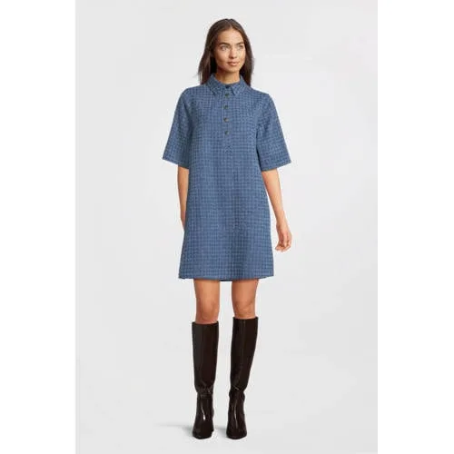 Ibo is een klassieke A-lijn jurk met knopen op de borst. Ze heeft een kraag en 2/4 mouwen. Het materiaal heeft een denim-achtige uitstraling en heeft een textuur die het ruitpatroon benadrukt.
