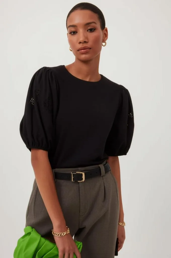 De MSCH Copenhagen Cebrina top in zwart is een verfijnde basic met een vrouwelijke twist. Deze jersey top is gemaakt van een zachte en rekbare katoenmix die zorgt voor optimaal comfort én een mooie pasvorm. De ronde halslijn, 2/4 mouwen en het subtiele bloemenborduurwerk op de mouwen maken deze zwarte top net even specialer dan een standaard T-shirt. Dankzij de normale pasvorm is de Cebrina top veelzijdig te combineren – draag hem casual met jeans of gestyled met een rok of pantalon voor een elegante touch. Het is de perfecte dagelijkse top die moeiteloos stijl en eenvoud samenbrengt. Product details: Merk: MSCH Copenhagen Model: Cebrina top Kleur: Zwart Pasvorm: Normale fit Mouwen: 2/4 lengte Halslijn: Ronde hals Detail: Subtiel bloemenborduurwerk Materiaal: 93% katoen, 7% elastaan Stof: Zachte jersey met stretch Stijl: Casual, vrouwelijk, basic met een twist