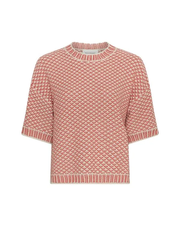 Gebreide pullover met een grafisch patroon en losse korte mouwen. Afgewerkt met geribbelde randen bij de hals, mouwen en zoom voor een nette en moderne uitstraling. Een makkelijk te combineren item, geschikt voor zowel casual als gelaagde outfits. ModelmaatHet model is 178 cm lang en draagt maat S/M. PasvormLosse pasvorm HalslijnRonde hals MouwlengteKorte mouwen Kleur: oatmeal f rose Materiaal: 47% Cotton, 33% Recycled polyester & 20% Acrylic.