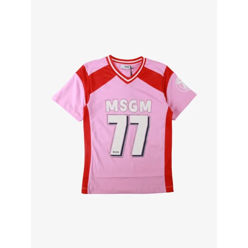 De MSGM Junior Jersey Mesh Jurk in de kleur Pink Lilac is een baseball model jurk. De jurk is roze met rode mesh details. De jurk heeft een MSGM 77 logo met strass stenen.
