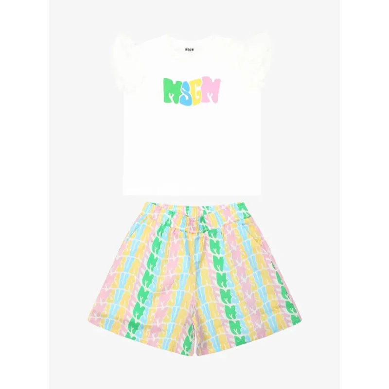 Set voor meisjes van het merk MSGM in de kleuren groen, roze, blauw en geel met een korte broek en bijpassend T-shirt met ruffle-detail.