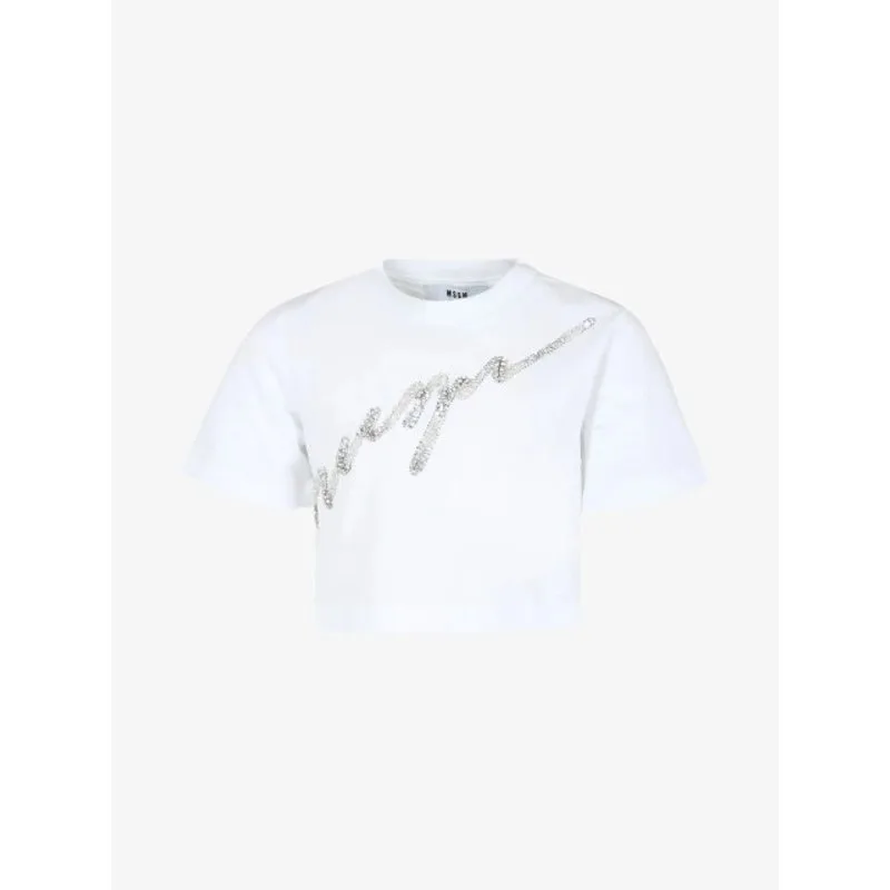 Het MSGM Kids Shirt in Wit heeft een cropped pasvorm met een logo in steentjes. Combineer het shirt met de bijpassende MSGM joggingbroek en blazer of rok.