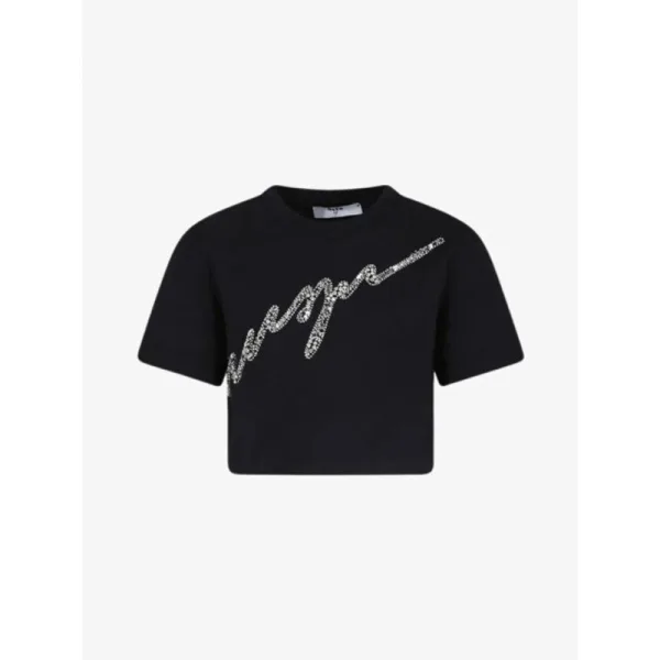 Het MSGM Kids Shirt in Zwart heeft een cropped pasvorm met een logo in steentjes. Combineer het shirt met de bijpassende MSGM rok, een panty of maillot en een leren jasje.
