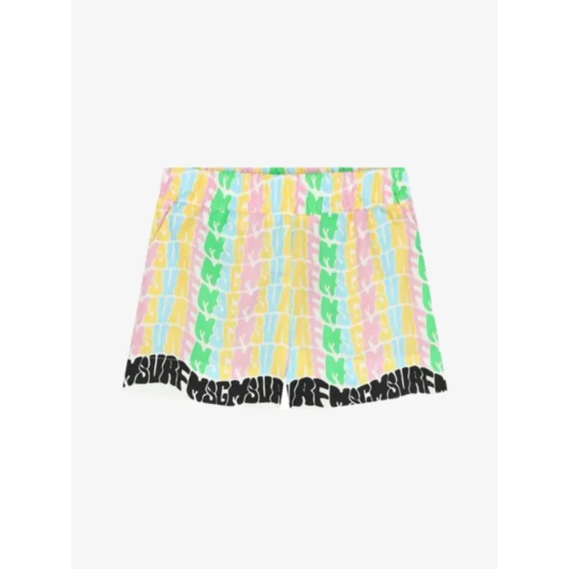 De MSGM Junior Poplin Short in de kleur Multicolor heeft een all over print in roze, geel, aqua en groen en een zwarte logo rand aan de onderkant. Het shortje heeft een elastieke tailleband en steekzakken.