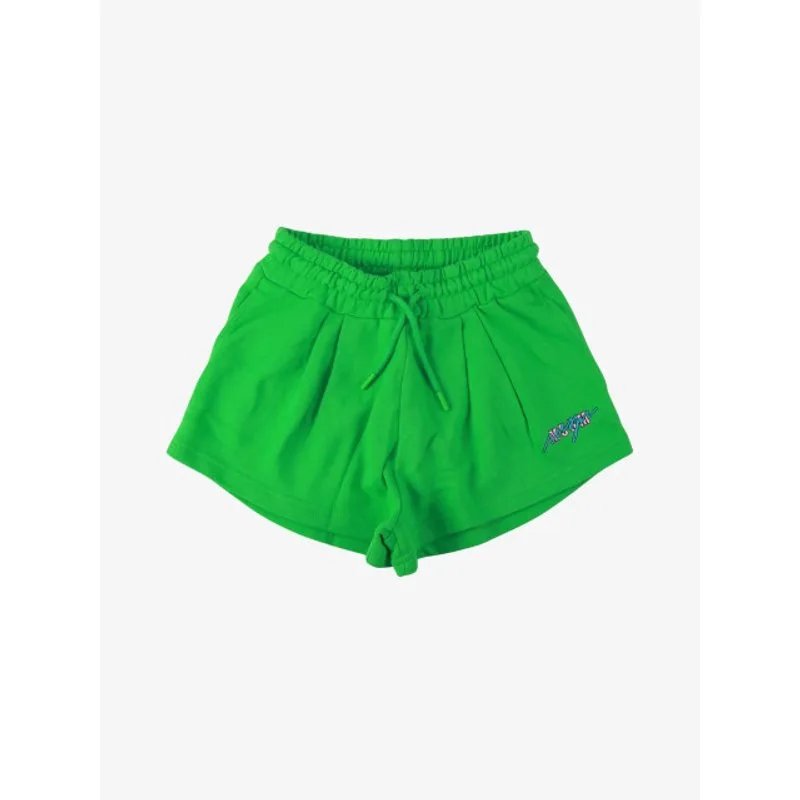 De MSGM Junior Short in de kleur Irish Green heeft steekzakken, een elastieke tailleband en aantrekkoorden. De short heeft een logo met roze en blauw op het been.