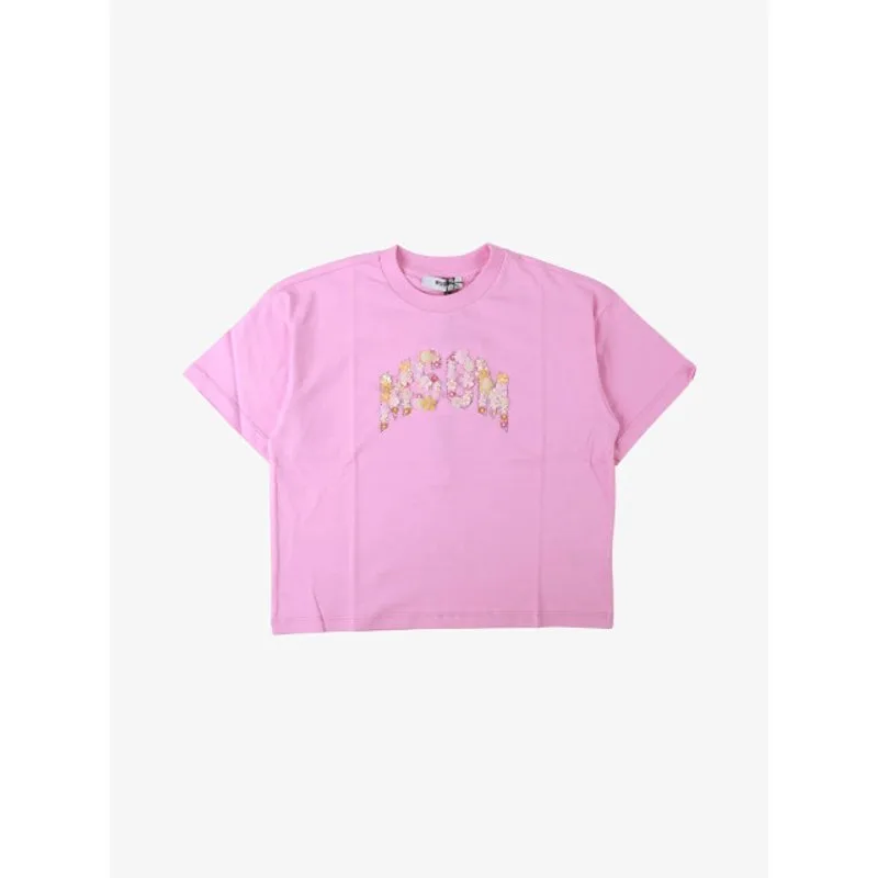 Het MSGM Junior Oversized T-shirt in de kleur Pink Lilac heeft een oversized pasvorm en het logo met strass stenen en bloemen in pailletten en kralen. Wij adviseren een maat kleiner.