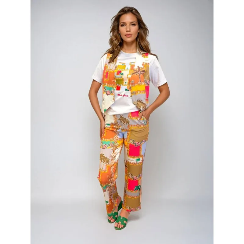 PRODUCTDETAILS MUCHO GUSTO® Broek Lesbos Palm Zomer Patchwork De MUCHO GUSTO® Broek Lesbos Palm Zomer Patchwork is een levendige viering van kleur, zelfvertrouwen en zomerse energie. Deze broek is ontworpen met een opvallend patchwork van tropische palm motieven, barok geïnspireerde frames en zonovergoten tinten en belichaamt de levendige essentie van een stijl voor warm weer. Tinten oranje, roze, groen, goud en wit gaan harmonieus samen en creëren een gedurfd visueel verhaal dat zowel exotisch als verfijnd aanvoelt. Het levendige ontwerp geeft de broek een expressief, opvallend karakter – perfect voor vrouwen die graag opvallen met een nonchalante flair. De Lesbos Palm Summer Patchwork-broek is gemaakt van een hoogwaardige stretchstof – 86% polyester en 14% elastaan – en biedt een flatterend, vrouwelijk silhouet met uitzonderlijk comfort en bewegingsvrijheid. De binnenbeenlengte van 75 cm zorgt voor een licht cropped, modieuze look die prachtig combineert met sandalen, hakken of sneakers, waardoor ze veelzijdig zijn voor zowel casual dagen als chique zomermomenten. Deze broek is ideaal voor wie elke outfit een zonnig tintje wil geven en combineert speelse kunstzinnigheid met verfijnd Nederlands design. Of je hem nu combineert met een eenvoudig T-shirt of een bijpassend statement-stuk, hij geeft je garderobe direct meer kleur, creativiteit en zelfvertrouwen. Nederlands design Materiaal: 86% polyester, 14% elastaan Beschikbare maten: XS, S, M, L, XL, XXL, 3XL Kleur: oranje, roze, blauw, groen