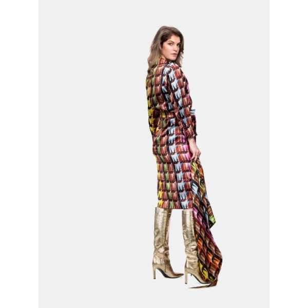 MUCHO GUSTO® Zijden jurk Scandicci Logomania Multicolor. Deze zijden jurk Scandicci logomania multicolor van MUCHO GUSTO® is een echte blikvanger. De warme winterkleuren, de strikceintuur en de gouden knopen van deze Scandicci jurk zorgen voor een vrouwelijke look. Dutch handmade Materiaal: 97% Zijde 3% EL Normale pasvorm Logomania Multicolor CB Lengte: 115 cm