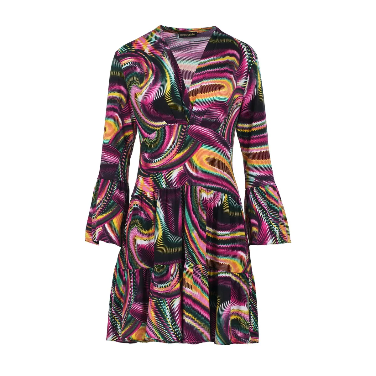 Deze zomerjurk is gemaakt van stretch jersey stof. Het heeft een diepe V-halslijn in een faux wrap-stijl. Het heeft bell mouwen, 7/8 lengte. Onder de buste is een gebogen zoom. De rok heeft twee lagen met ruches. De jurk valt boven de knie en is gestyled in een los A-lijn silhouet.