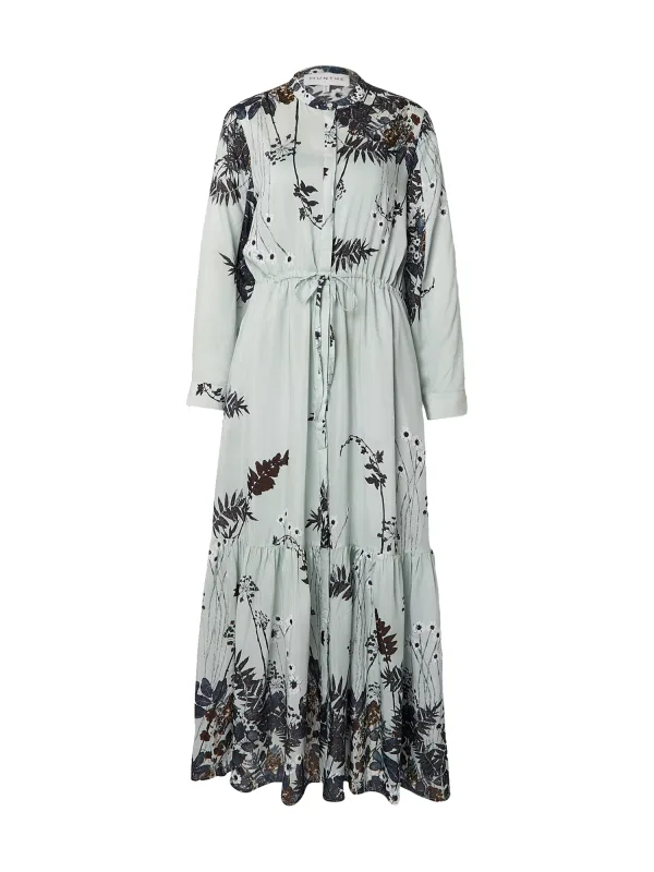 Design: Gevoerde zoom/rand, A-lijn, Verborgen knop placket; Type sluiting: Knoopsluiting; Materiaal: Viscose; Motief: Bloemenprint; Kraag: Zonder kraag; Details: Volant, Gedrapeerd; Extra's: Verstelbare taille, All-over patroon, Gladde stof; Lengte: Lang/maxi; Snit: Uitlopend; Pasvorm: Normale pasvorm; Armlengte: Lange mouw